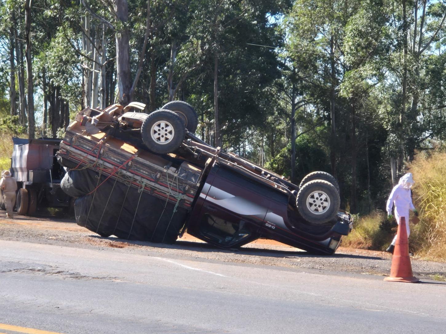 O Corpo de Bombeiros foi acionado no início da tarde desta sexta-feira (13/06) para prestar apoio à concessionária Way262 na BR-262, km 607, onde uma caminhonete D20, transportando cerca de 40 caixas de abelhas vivas (colmeias de apicultor), havia capotado.