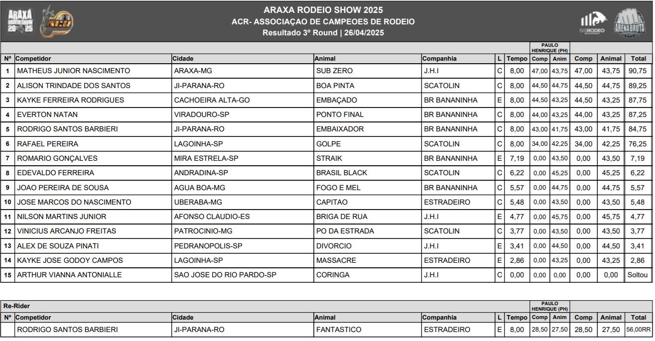O terceiro round do rodeio do ARS definiu neste sábado (26) os dez peões que vão disputar as finais do campeonato neste domingo (27). O grande destaque da noite foi Mateus Junior Nascimento, de Araxá. Ele marcou 90.75 pontos montando o touro Sub Zero (J.H.I). Com essa nota, o peão garantiu o sexto lugar na classificação geral do evento. Ele soma 174,75 pontos.