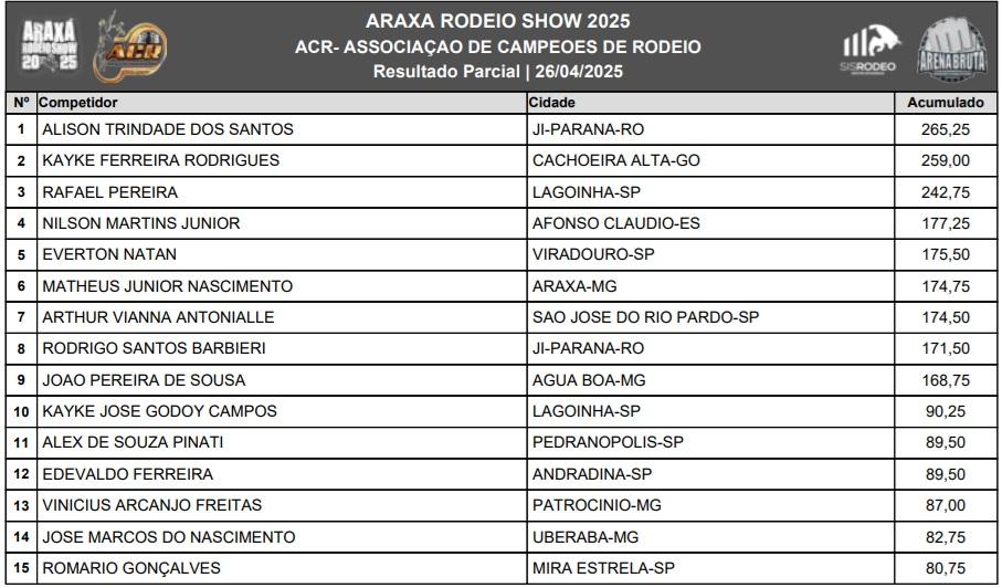 Após três noites, só três competidores seguem invictos, o que ainda deixa a competição totalmente em aberto. Os peões voltam à arena mais cedo neste domingo (27), a partir das 19h. “Dos 15 que disputaram neste sábado, dez vão às finais neste domingo, quando saberemos quem será o campeão de 2025”, ressalta o organizador, Moacir Abadio.