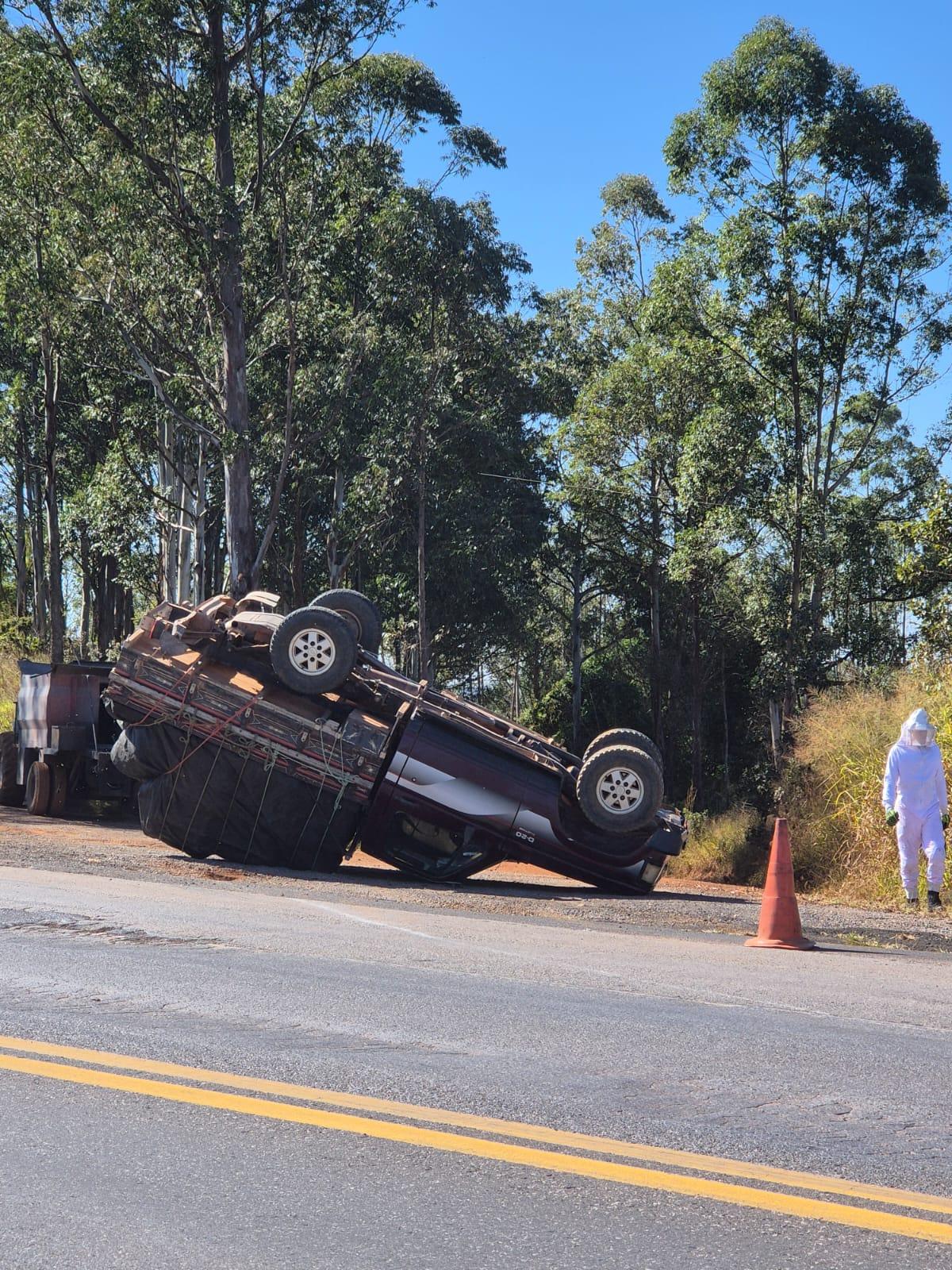 O Corpo de Bombeiros foi acionado no início da tarde desta sexta-feira (13/06) para prestar apoio à concessionária Way262 na BR-262, km 607, onde uma caminhonete D20, transportando cerca de 40 caixas de abelhas vivas (colmeias de apicultor), havia capotado.