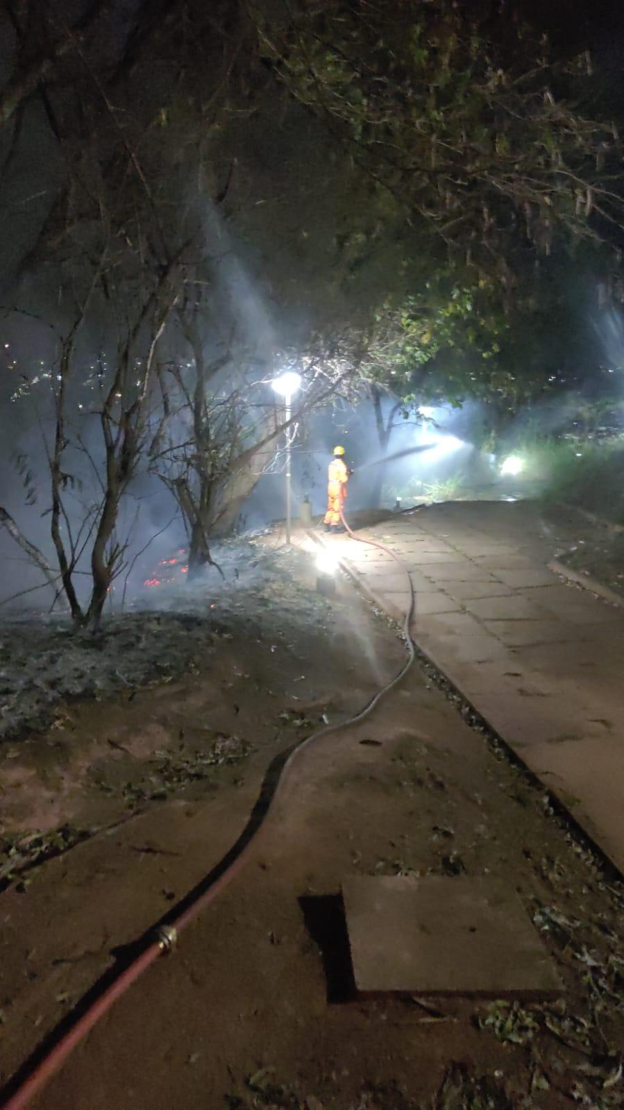 Segundo os bombeiros, parte da vegetação já havia sido queimada mais cedo no mesmo dia, mas outro foco foi identificado no interior do parque. A guarnição utilizou três mangueiras para o lançamento de água e conseguiu extinguir o fogo, evitando a propagação para outras áreas.